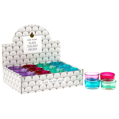 Glass Tealight Holder 4 Asstd Cols 8.5x9cm- Regular price
